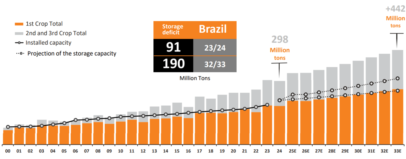 Estima-se que o déficit de armazenagem de grãos no país hoje encontra-se próximo de 91 milhões de toneladas (haja tupperware). E pior, se mantivermos o ritmo de crescimento, a tendência é que cheguemos a 190 milhões de déficit na safra de 2032/2033.